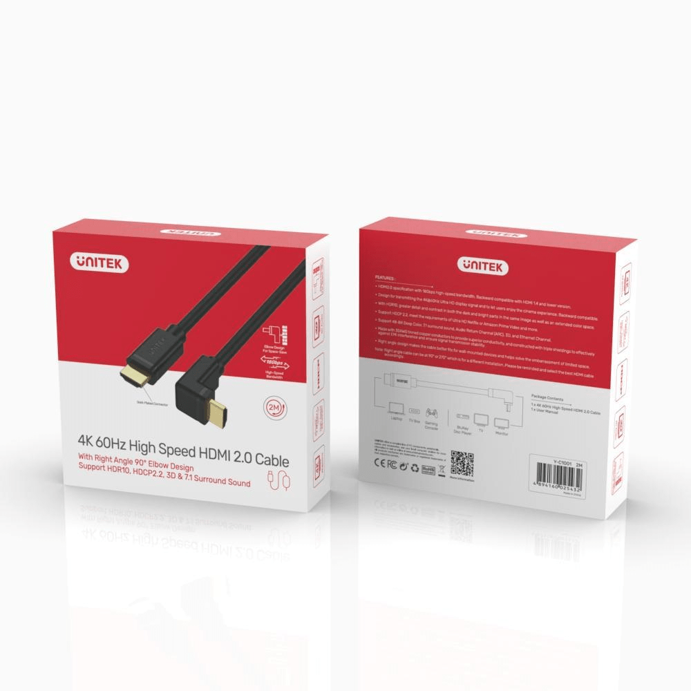 Unitek 2m 4K 60Hz High Speed HDMI 2.0 Right Angle 90-Degree Cable Y-C1001